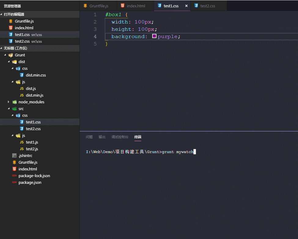 grunt mywatch //控制台提示watch已经开始监听, 修改源文件保存后会自动编译处理