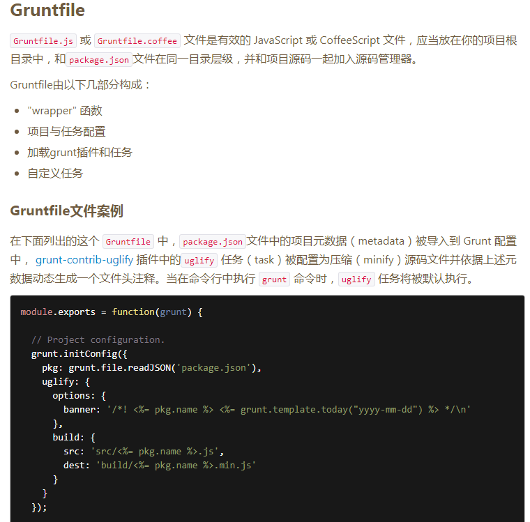 基本编码(下面是以 uglify 插件为例),grunt 的任务执行其实并不是本身执行任务,而是调用旗下各种插件来执行各种任务。grunt 就像一个大脑一样,只是起到指挥作用: