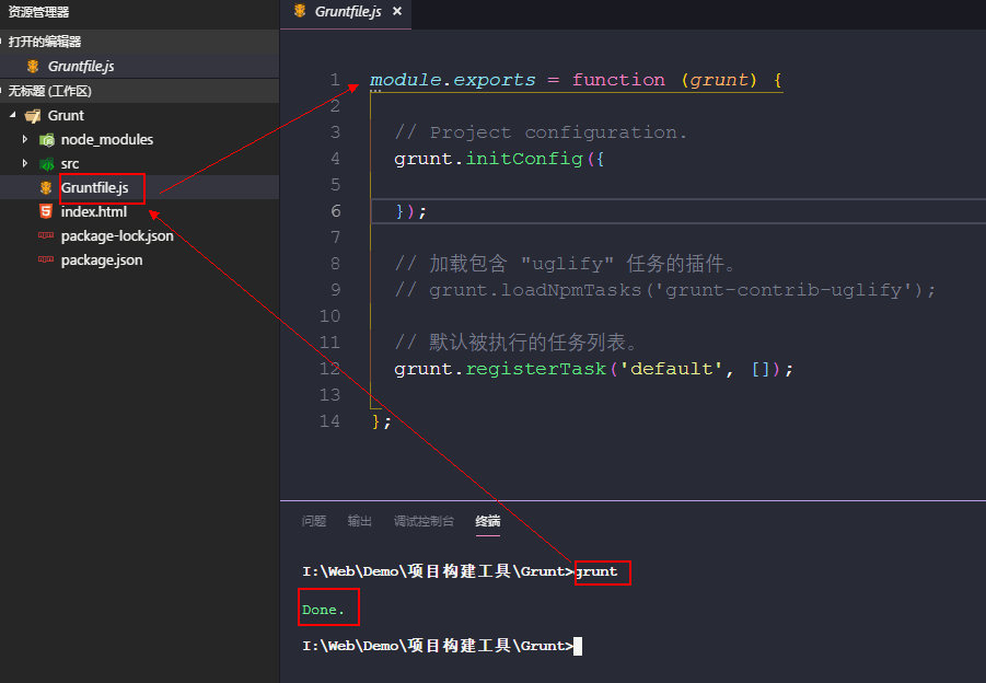 再次执行命令: grunt -------- 提示成功, 但没有任何效果(还没有使用插件定义任务,我们将其注释掉了)