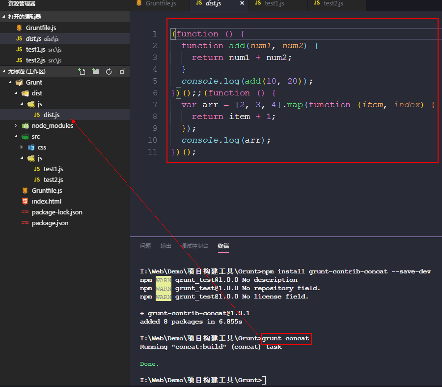 grunt concat(或者直接使用grunt,会按顺序自动执行任务列表的任务。)