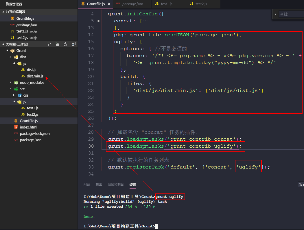grunt uglify(或者直接使用grunt,会按顺序自动执行任务列表的任务。先执行 concat,再执行uglify)