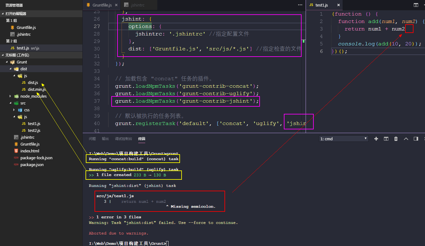 需要注意的是:直接使用grunt,会按顺序自动执行任务列表的任务。先执行 concat,再执行uglify,这就说明 Grunt 是同步执行任务的。