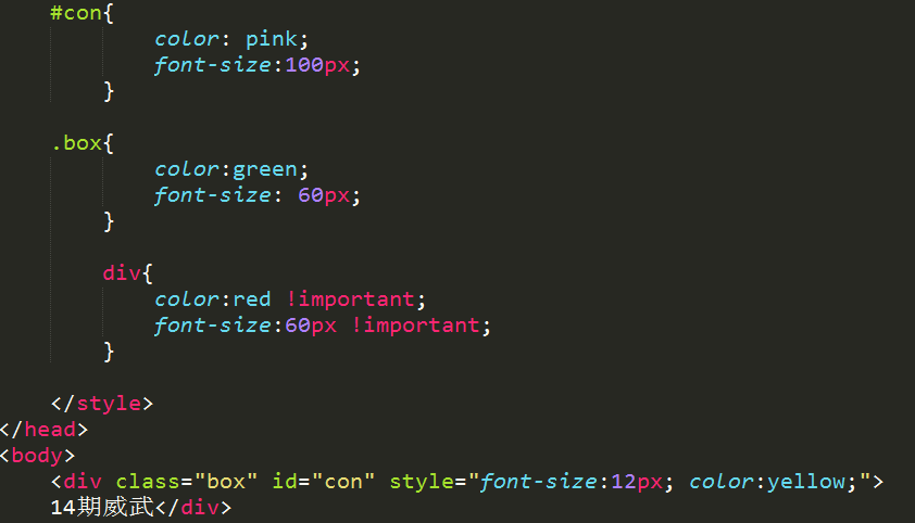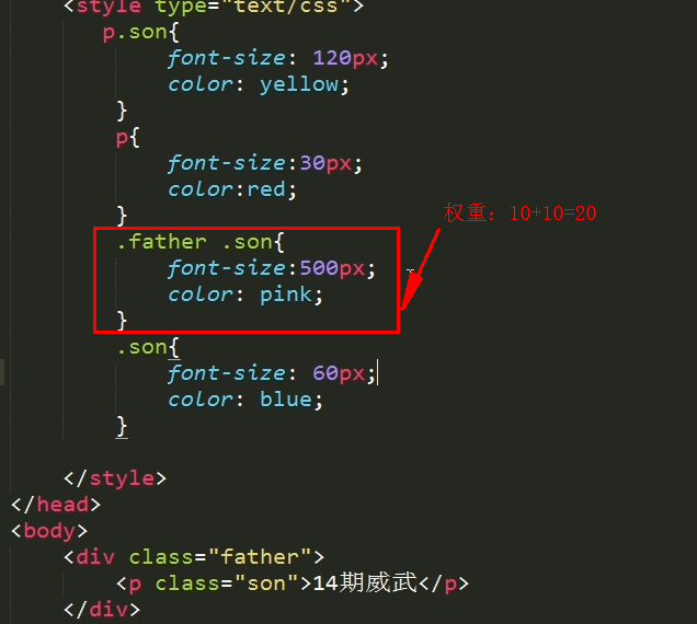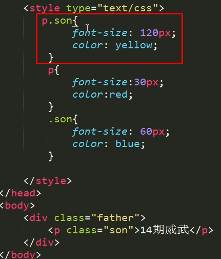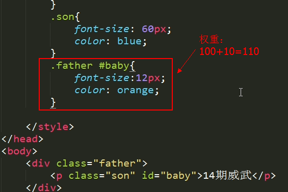 (上图:类选择器10+标签选择器1=11,所以最后14期威武显示的是黄色)