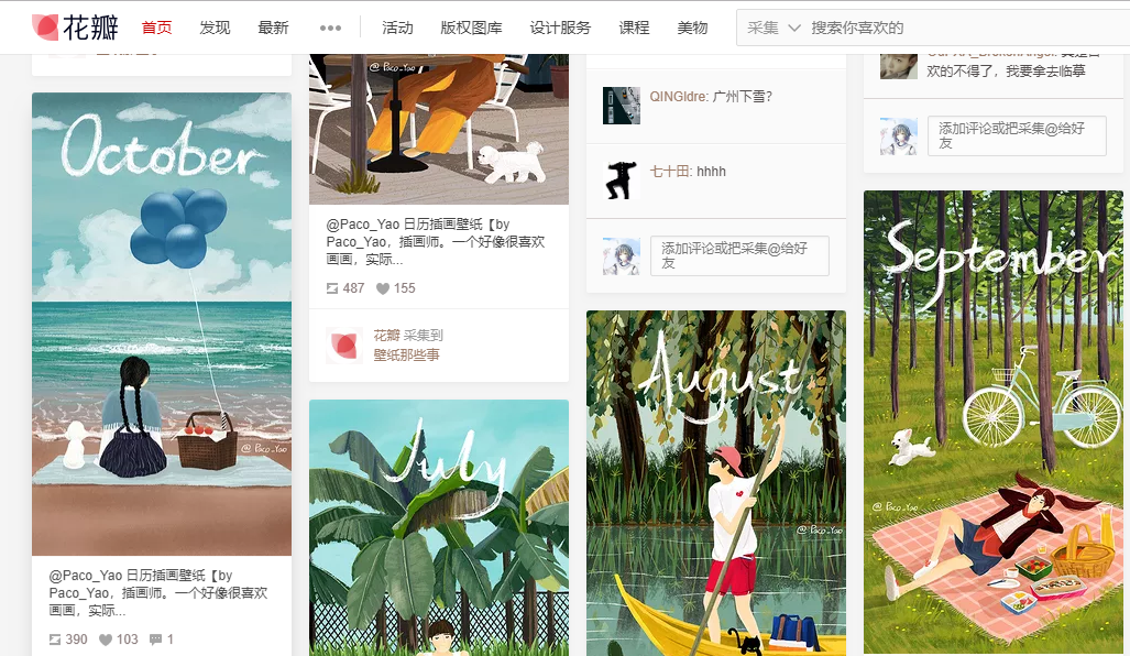 我们有时候逛网站的时候,有的图片网站的图片排列在纵向上是错落有致的,并不是高度统一的,如下图,这个效果是怎么做的呢?(下图是我截取花瓣网站的图片)