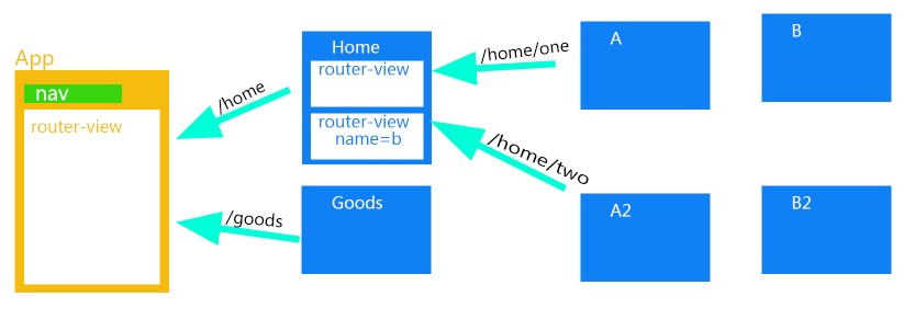 我们在加载/home/one路由的时候,没有名字的router-view加载A组件,有名字的router-view加载B组件;