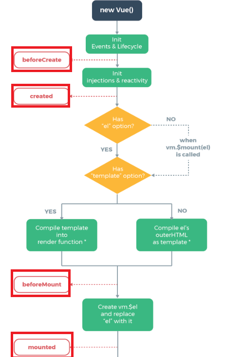 • beforeMount:此时已经完成了模板的编译,但是还没有从内存挂载到页面中。