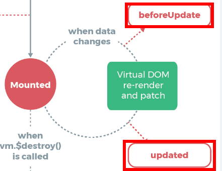 • updated:updated 事件执行的时候,页面和 data 数据已经保持同步了,都是最新的。