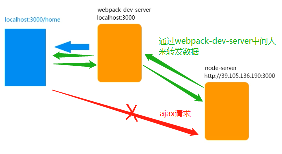 我们不能直接访问node-server的数据,但是可以把webpack-dev-server作为中间人,我们把ajax请求发给webpack-dev-server然后由它转发给node-server,由于服务器之间不存在同源策略的限制,所以这是行得通的。